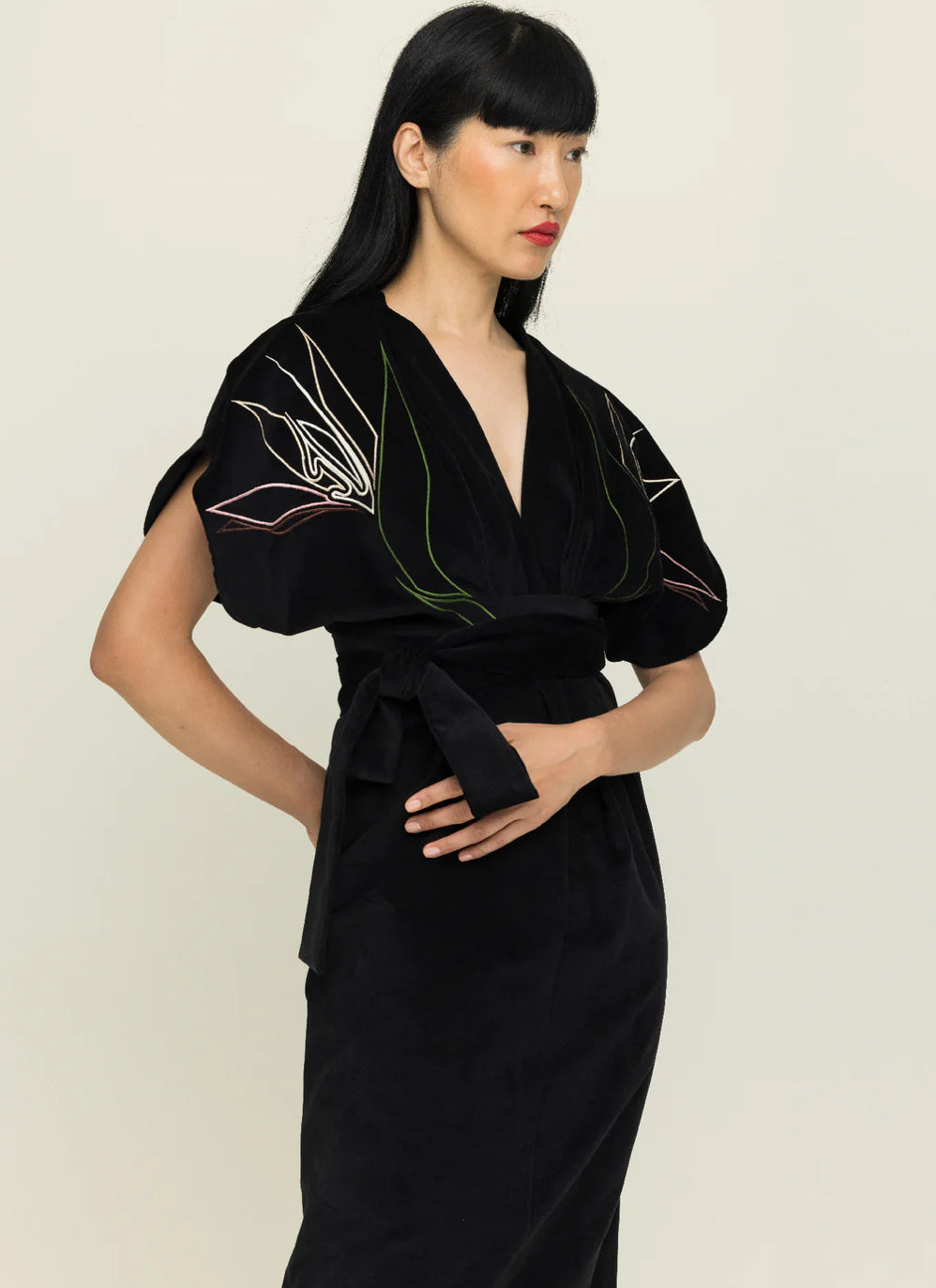 Graphic linear embroidery, inspired by the Bird of Paradise plant, a symbol of freedom, grace, and soaring spirit, runs across the sleeves in soft floral tones with accents of red, pink, and neutrals, creating an extraordinary design.