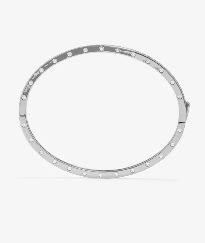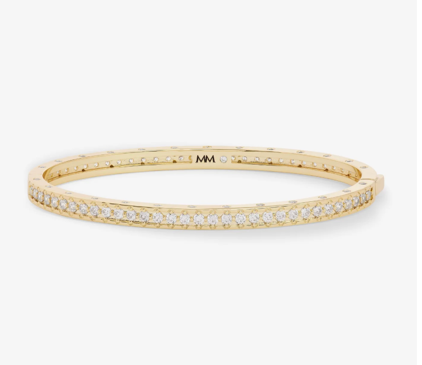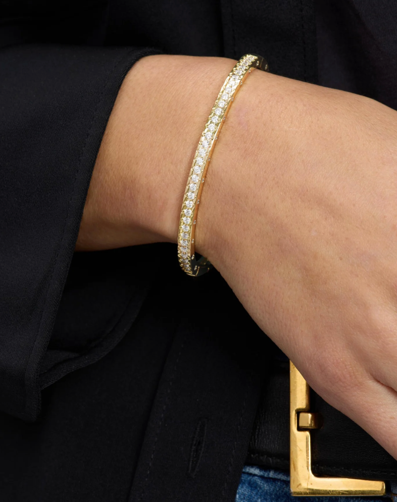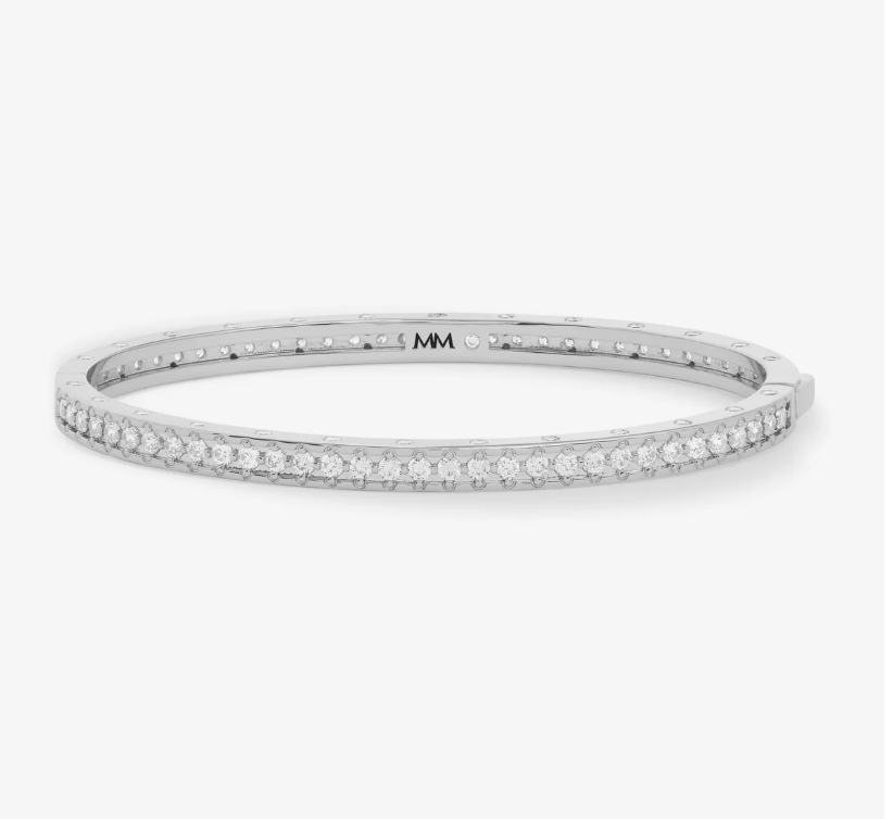 MELINDA MARIA's Ashley Rodeo Cuff combines bold Western-inspired design with refined elegance. Featuring distinctive lock-inspired detailing and brilliant bezel-set round simulated diamonds, this statement cuff showcases a substantial 9mm profile that commands attention. The seamless hinge mechanism closes effortlessly for a secure, polished finish. A versatile piece that transitions from day to evening with understated sophistication.