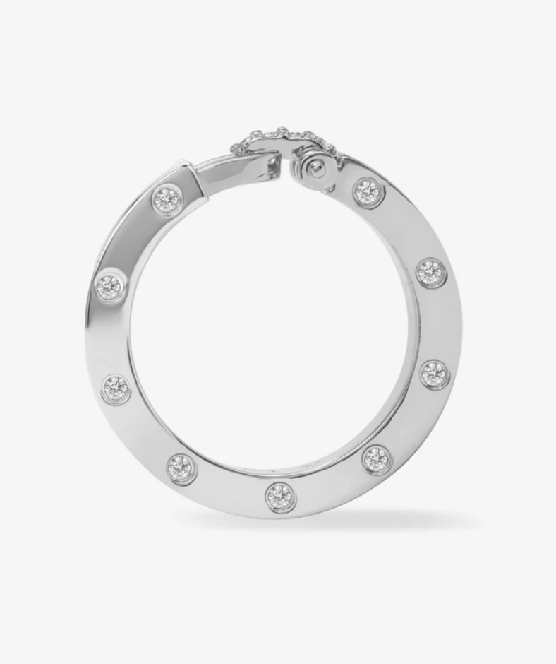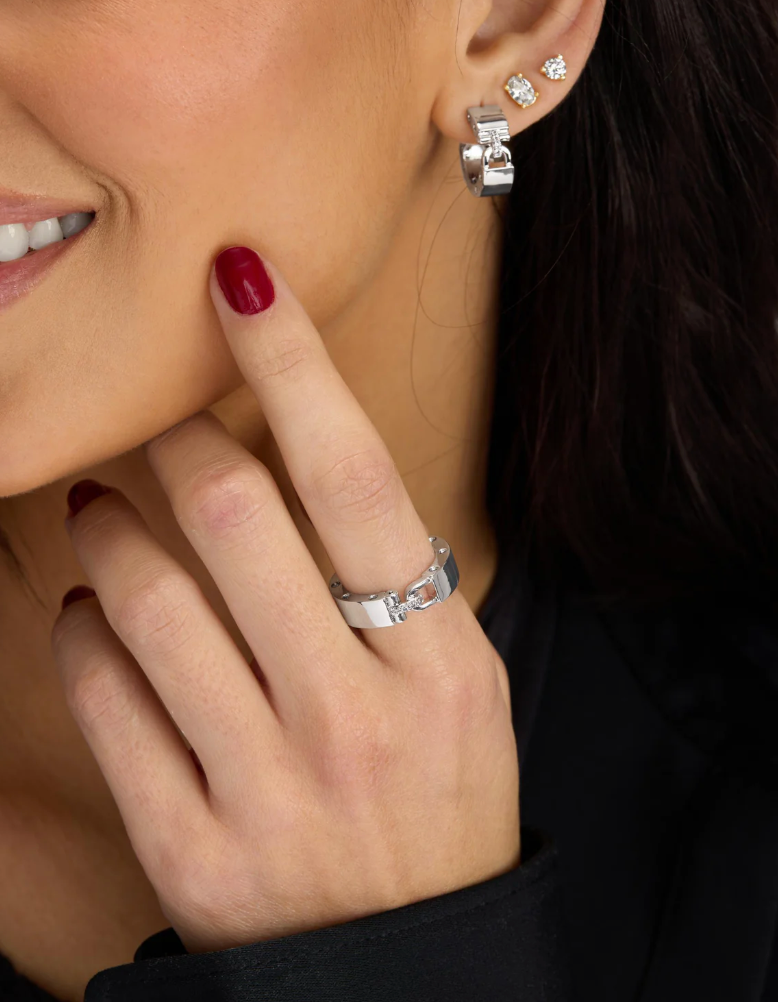 Unlock your signature style with MELINDA MARIA'S Ashley Smooth Lock Ring—a sleek, modern piece that whispers confidence. Featuring lock-inspired detailing and sparkling bezel-set round simulated diamonds, this refined ring strikes the perfect balance between bold and understated. Whether you're layering it with other pieces or letting it shine solo, the Ashley brings an unexpected edge to any jewelry collection. A conversation starter that feels effortlessly cool.