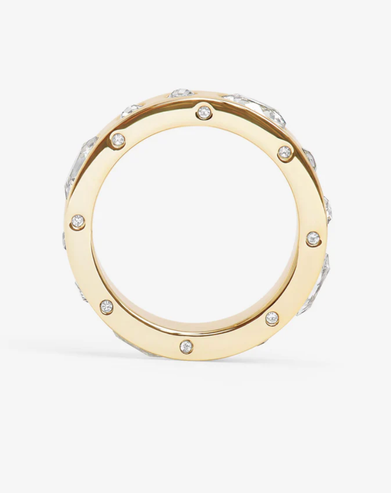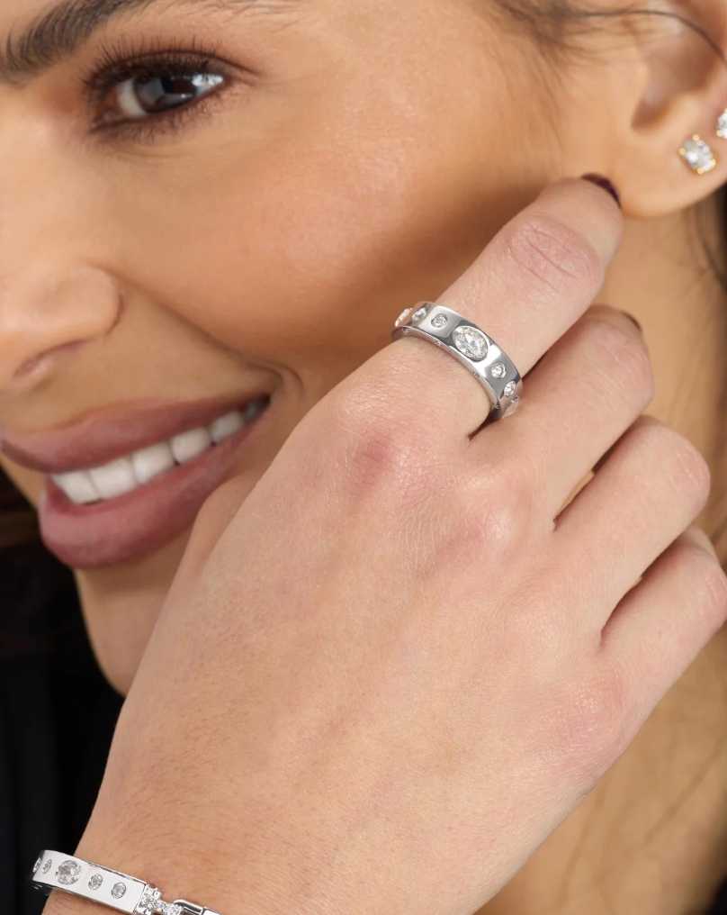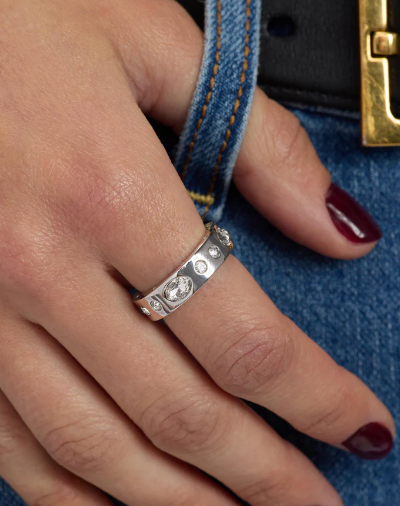MELINDA MARIA's Ashley Sunset Ring is your ticket to laid-back luxury. Crafted with a smooth, polished finish and crowned with a dynamic blend of oval and round bezel-set simulated diamonds, this ring nails that sweet spot between refined and relaxed. The thoughtful mix of stone shapes creates visual interest without feeling fussy—just pure, wearable elegance. Perfect for stacking, layering, or making a solo statement.