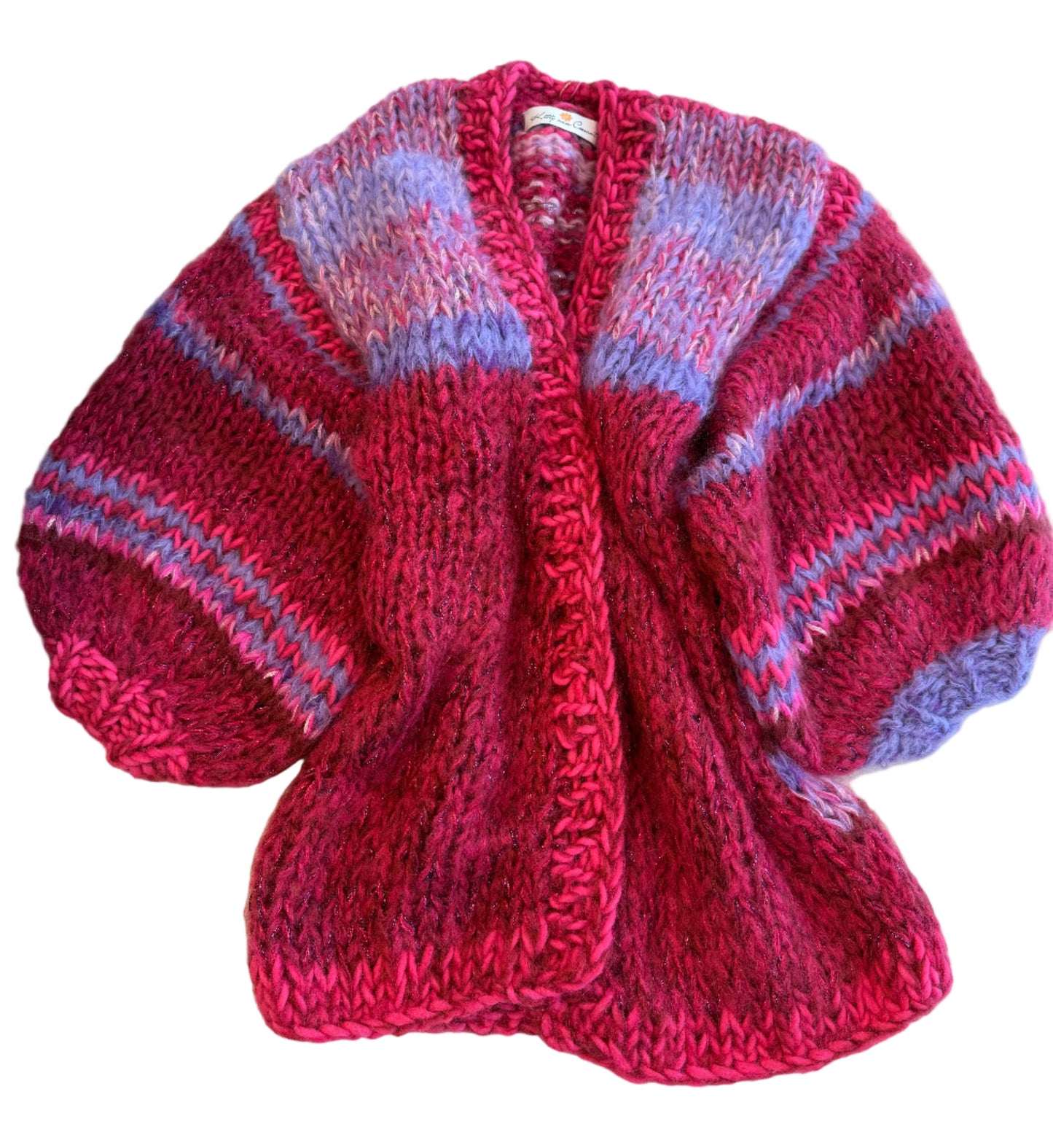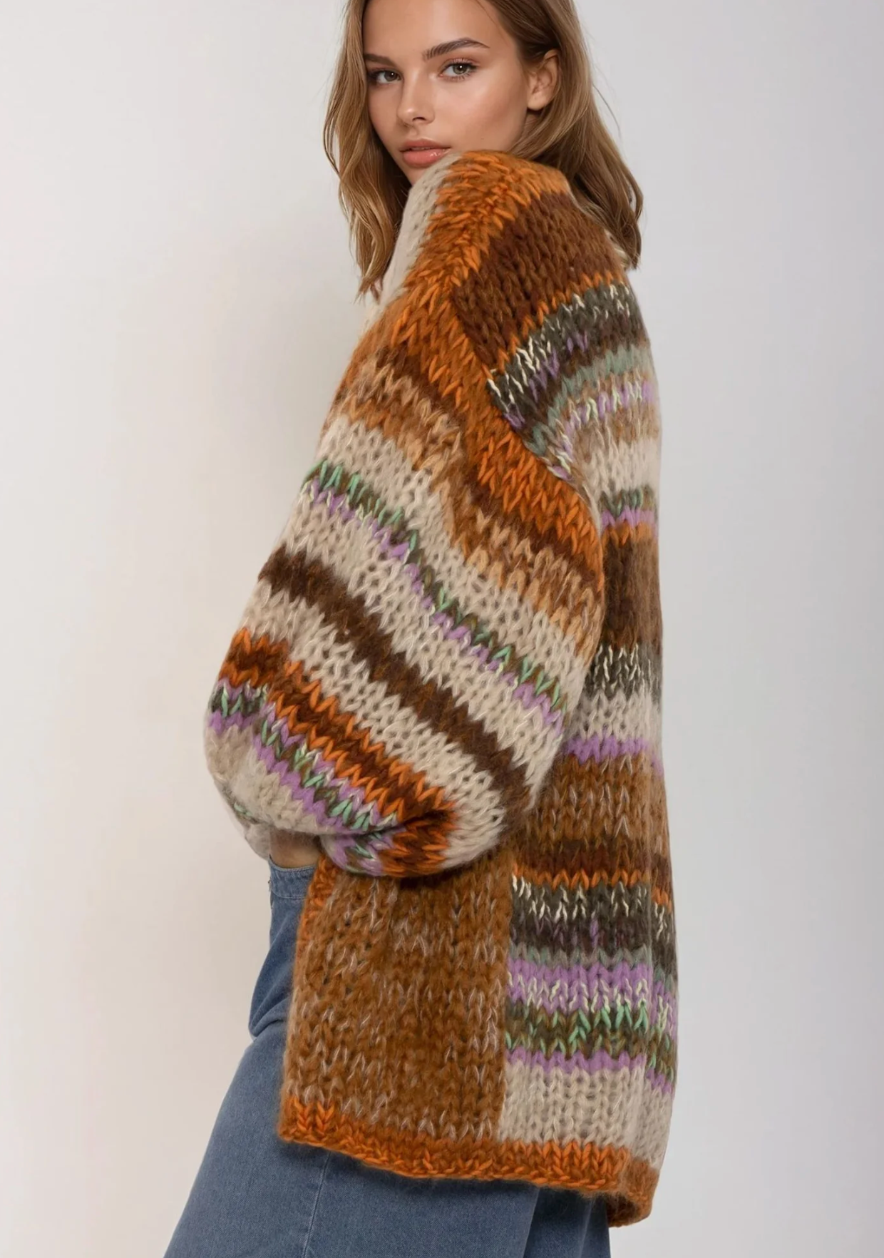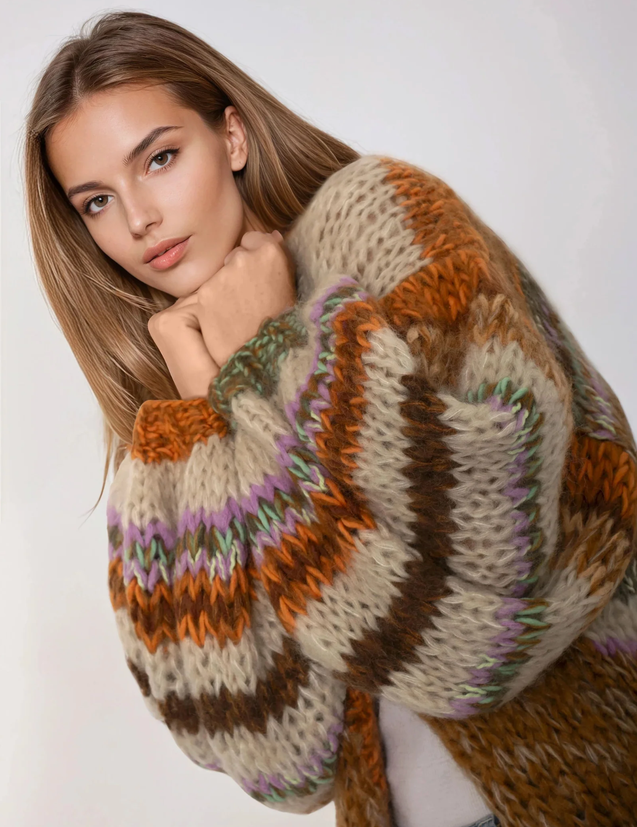 KITTY VAN COESANT's Biba Sweater is a bold and cozy statement piece bursting with character. Crafted from soft mohair in warm earth tones with playful lilac and green highlights, it offers a touch of retro charm. Its slightly oversized fit and balloon sleeves create a relaxed drape that effortlessly elevates your everyday jeans-and-tee look with a fun, stylish twist.