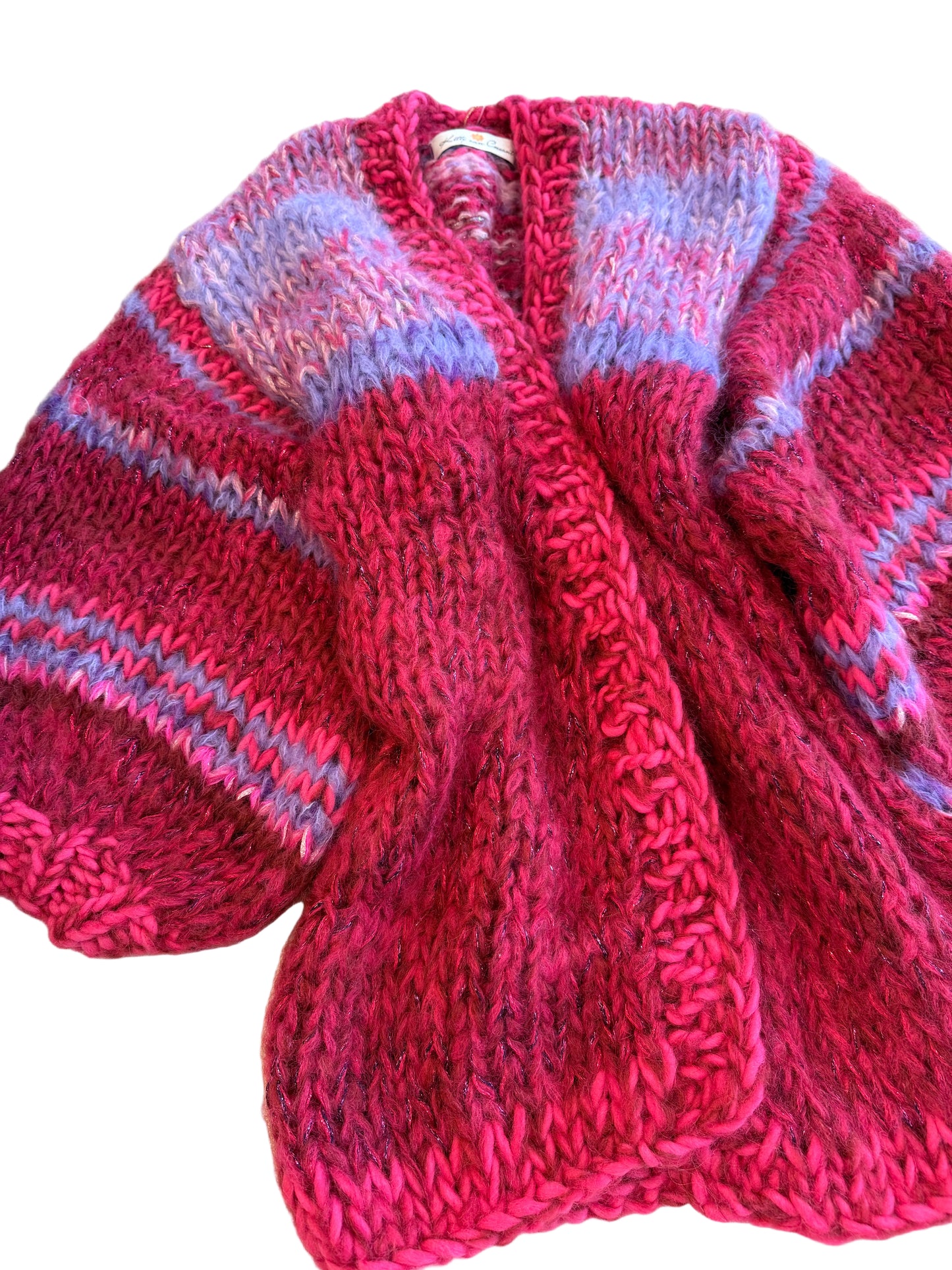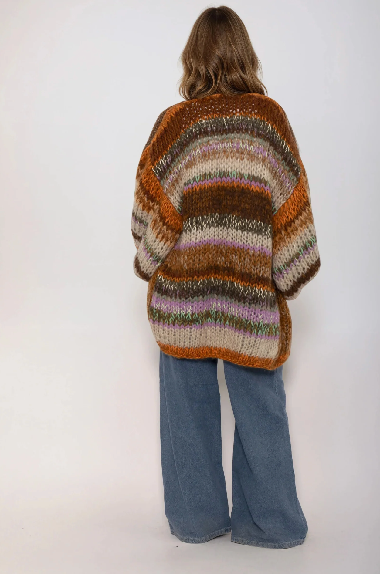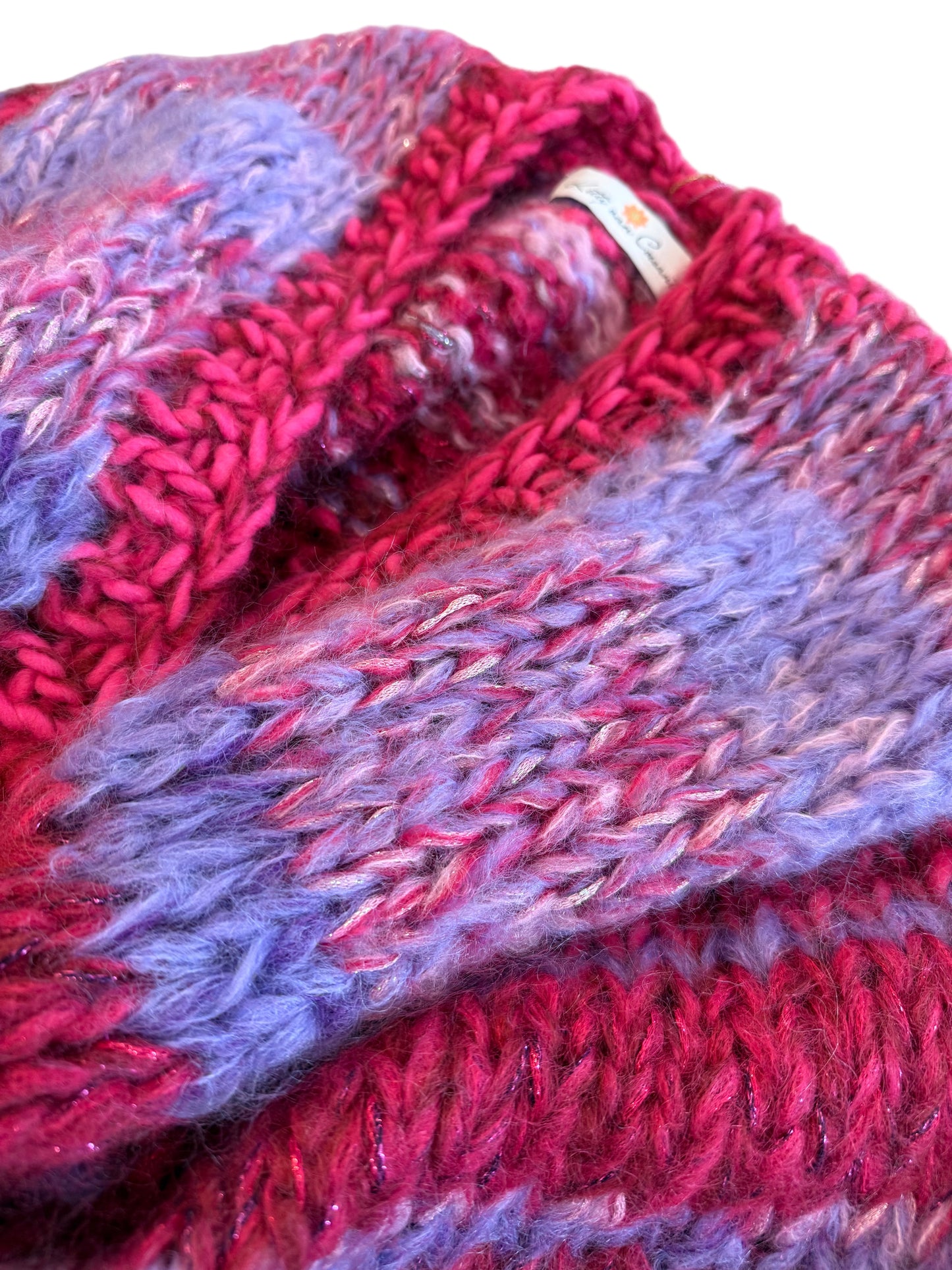 KITTY VAN COESANT's Biba Sweater is a bold and cozy statement piece bursting with character. Crafted from soft mohair in warm earth tones with playful lilac and green highlights, it offers a touch of retro charm. Its slightly oversized fit and balloon sleeves create a relaxed drape that effortlessly elevates your everyday jeans-and-tee look with a fun, stylish twist.