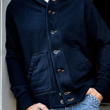 WIESMADE - Elevate your casual wardrobe with this refined shawl cardigan, a sophisticated alternative to standard hoodies. Crafted from 14oz diagonal knit fabric with a luxuriously soft premium cotton French terry interior, it delivers both comfort and polished style. Reinforced double-stitched seams ensure lasting durability, while subtle structural elements maintain a sharp silhouette. Distinctive tobacco-thread keyholes echo the detailing found in our signature denim. The generous body length and true-to-size fit create an elegant drape, enhanced by our specially weighted French terry construction that balances comfort with refined tailoring.