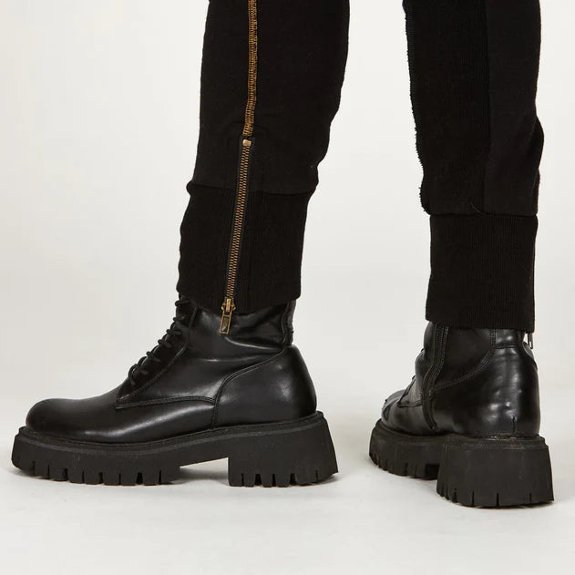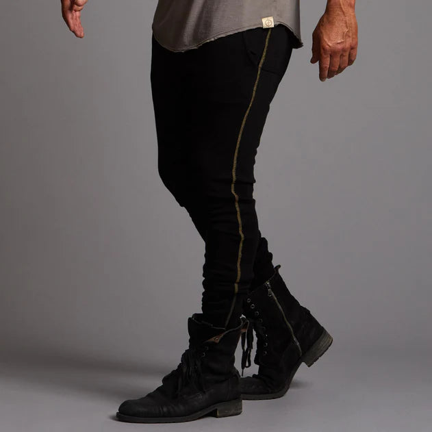 ONE GOLDEN THREAD - Crafted with Italian minimalism in mind, the Milanos Pant V3 merges structured elegance with luxurious comfort. Built from our proprietary TreeSilk™ blend of TENCEL BeechTree and Supima Cotton, these pants transition seamlessly from day to evening. Five strategically placed pockets—including a signature hip holster—keep essentials secure, while YYK ankle zippers offer versatile styling from straight leg to knee-high openings. Hand-tied drawcords, a hand-crafted 108 button fly, and golden thread detailing showcase meticulous craftsmanship. The form-fitting silhouette flatters all body types, balancing softness with subtle structure through contrasting crescent moon ribbing and overlocked seams. Available in White Stone, Blue Mineral, and Black.