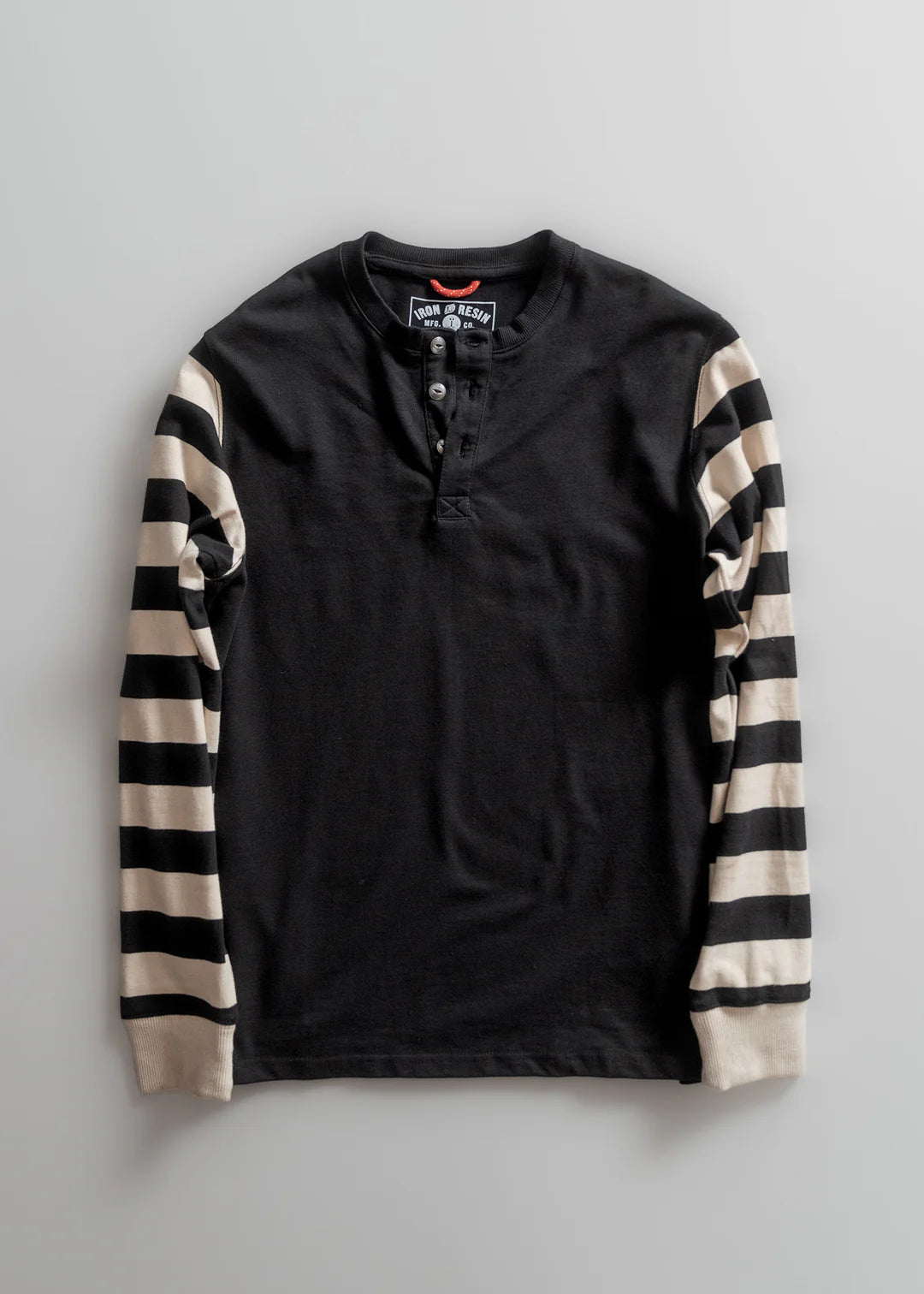 IRON & RESIN - Motor Henley is a heavyweight cotton essential inspired by vintage flat track racing aesthetics. This versatile piece features a classic three-button henley collar, vintage racing stripes on the sleeves, and custom metal hardware for refined durability. The substantial fabric and timeless design make it ideal for layering under jackets or wearing standalone. Crafted from 100% heavy-duty cotton with reinforced rib cuffs and a woven label detail, it's a sophisticated addition to any wardrobe.