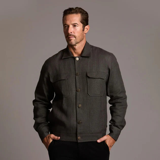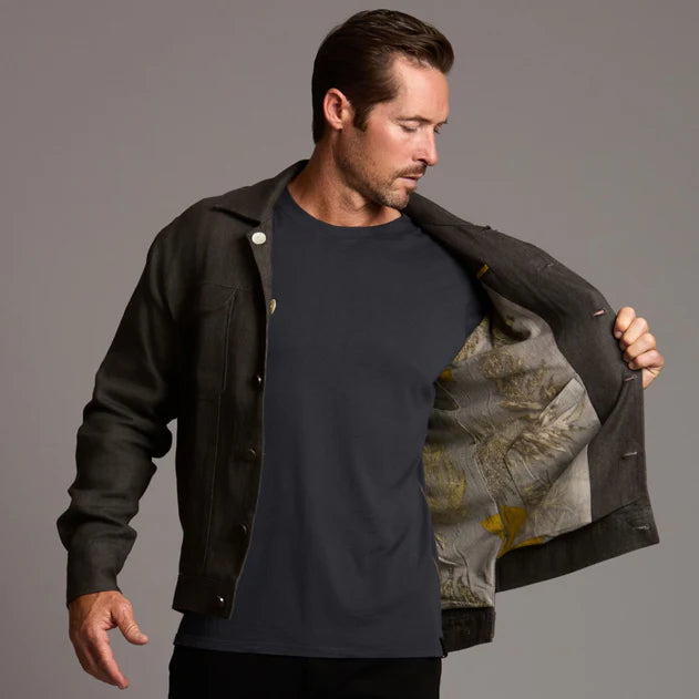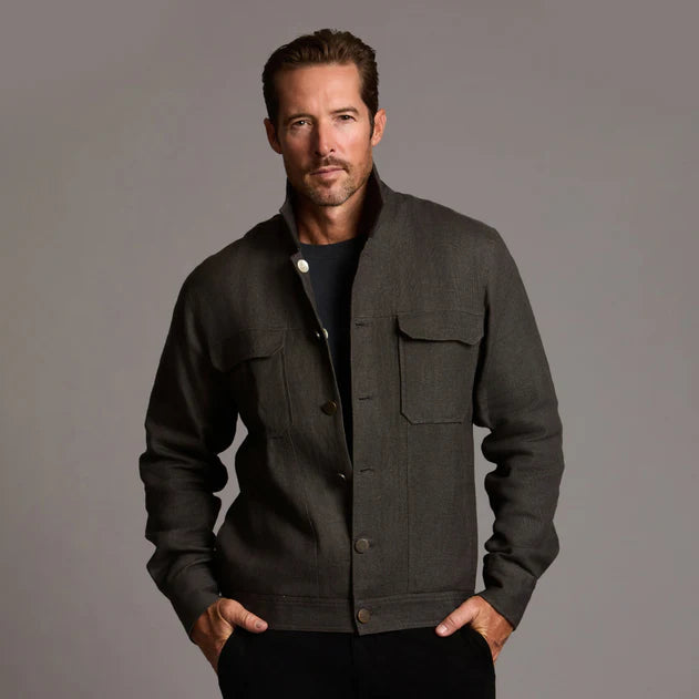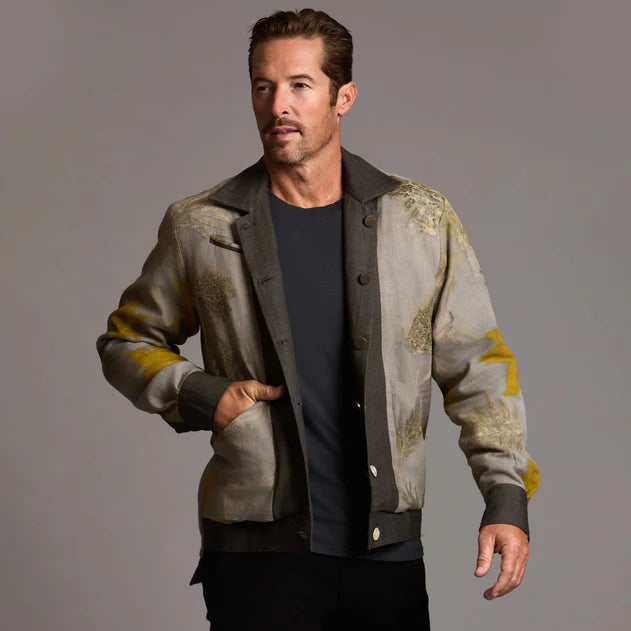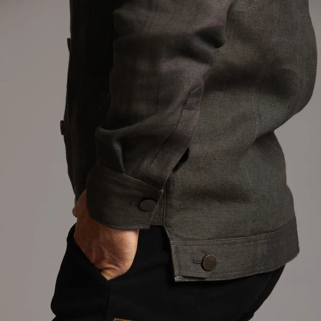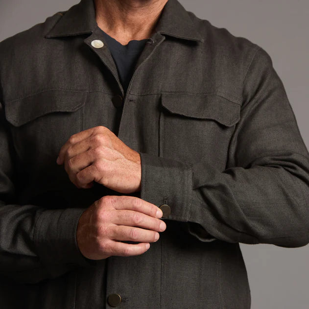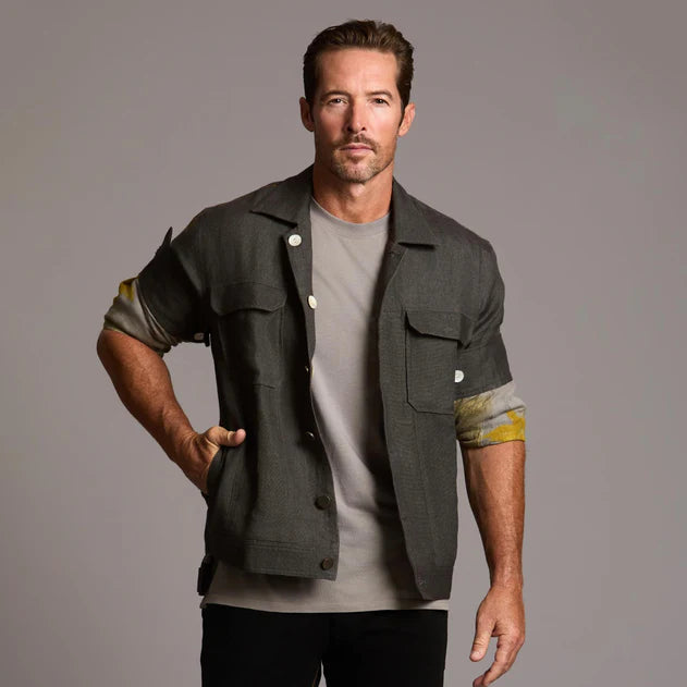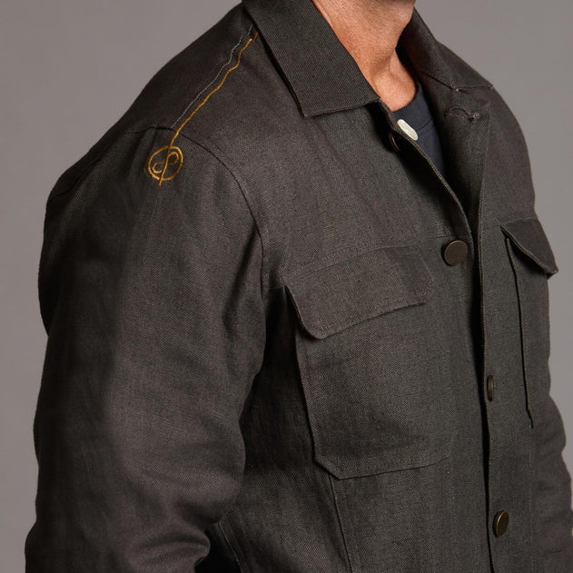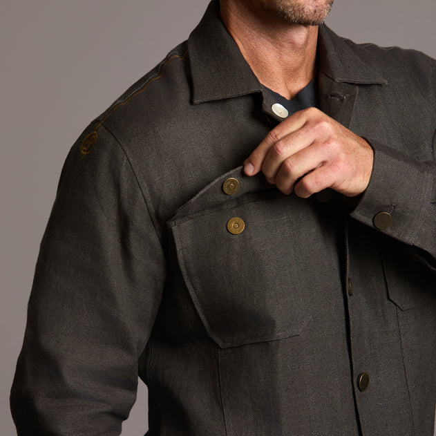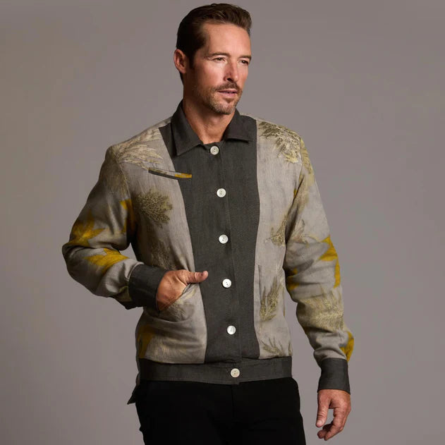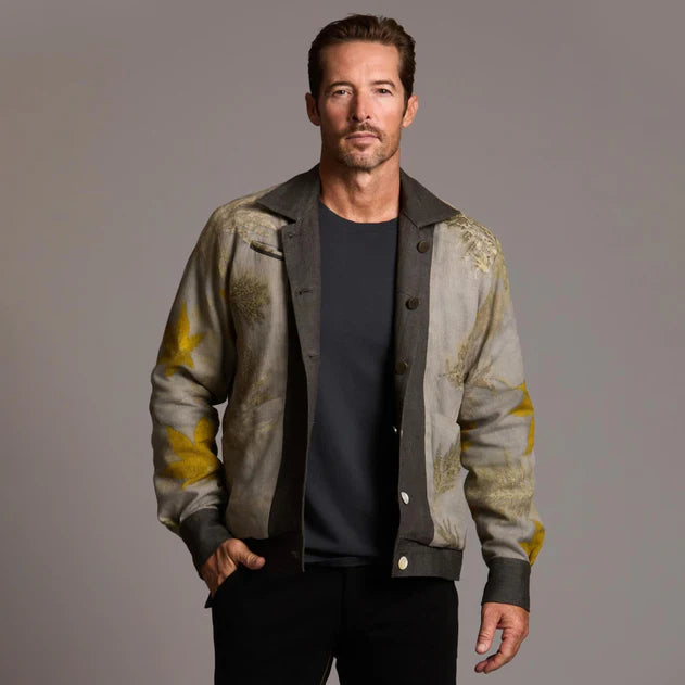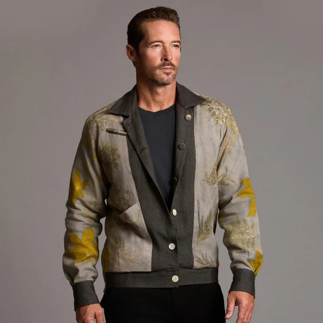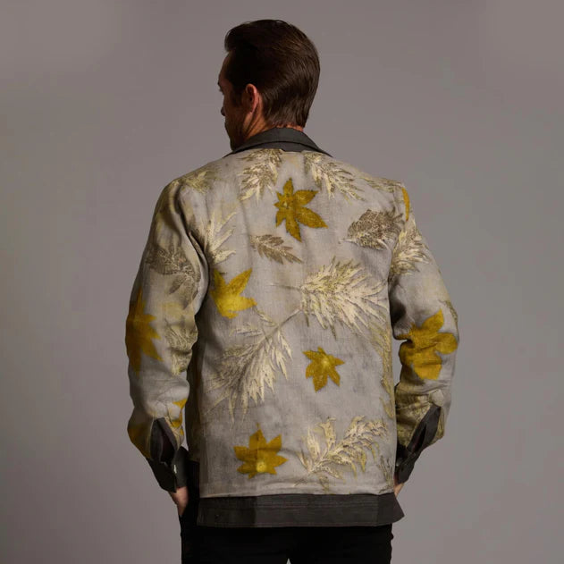 ONE GOLDEN THREAD - The Axis Jacket transcends everyday wear—it's a wearable art form. This inaugural piece from our Golden Label collection represents a commitment to timeless craftsmanship and intentional design. Collaboratively created with designer Hardik Tuteja and handmade in India, the Axis merges two distinct fabric experiences: a structured hemp-linen canvas exterior paired with hand-dyed Indian banana-leaf cotton that feels impossibly soft against skin. The interior reveals nature's artistry through hand-pressed leaf impressions, a detail reserved for those who truly know the piece. Reversible in spirit, the jacket transforms from relaxed open-front styling to a refined blazer silhouette. Practical elegance defines every element: magnetic chest closures, four exterior pockets, three interior compartments including a dedicated phone slot, mother-of-pearl buttons, and golden thread accents. A limited-edition investment designed to become part of your story.