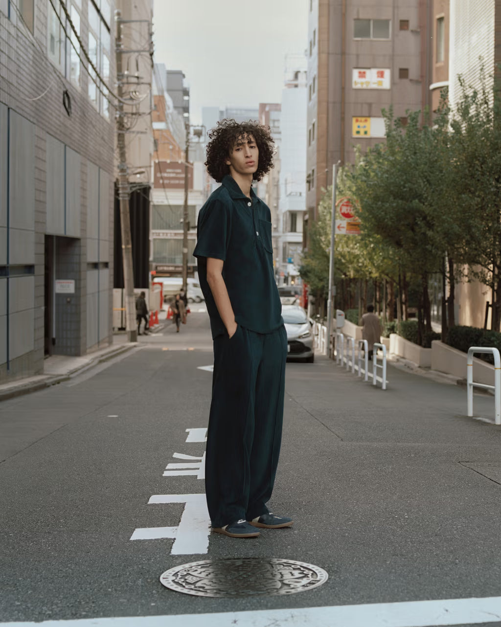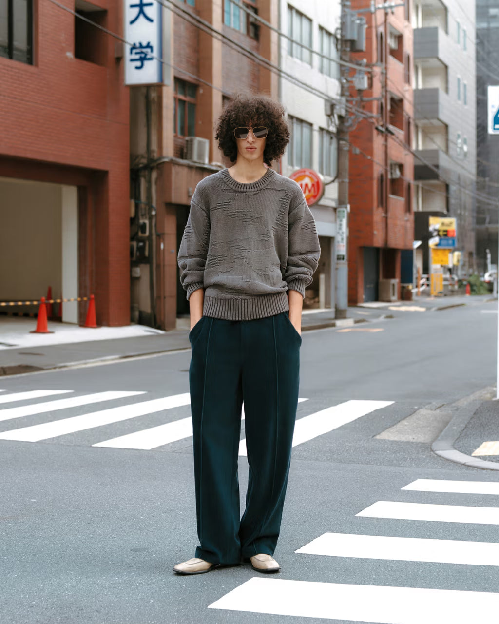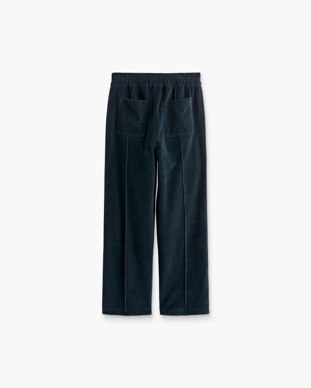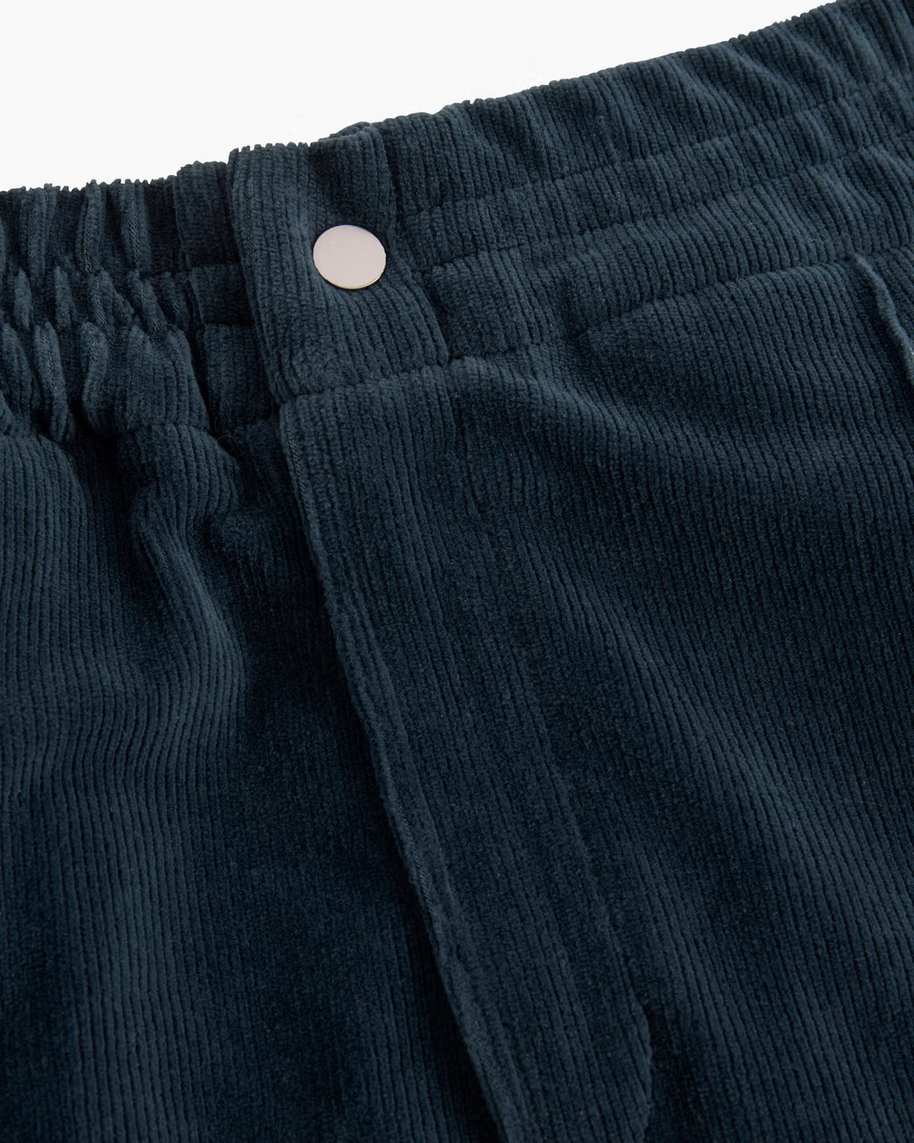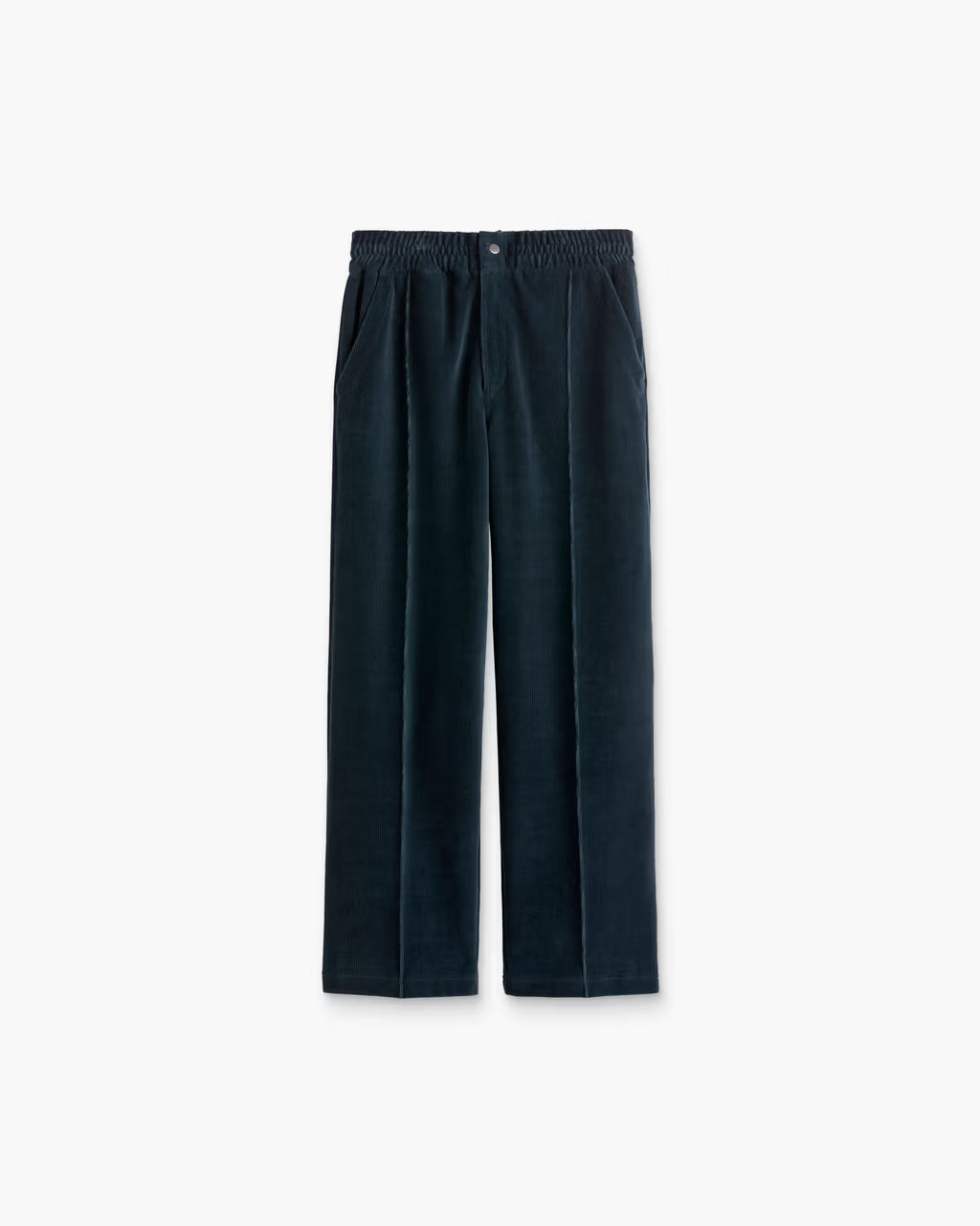 OAS- Dark blue knitted cord velour pants with a soft, subtly ribbed texture. Features an elastic waist with zip fly and snap button, stitched front and back pleats, and slanted side pockets. The relaxed fit and straight legs offer comfortable everyday wear. Crafted from 80% cotton and 20% polyester, designed in Stockholm and made in Portugal.