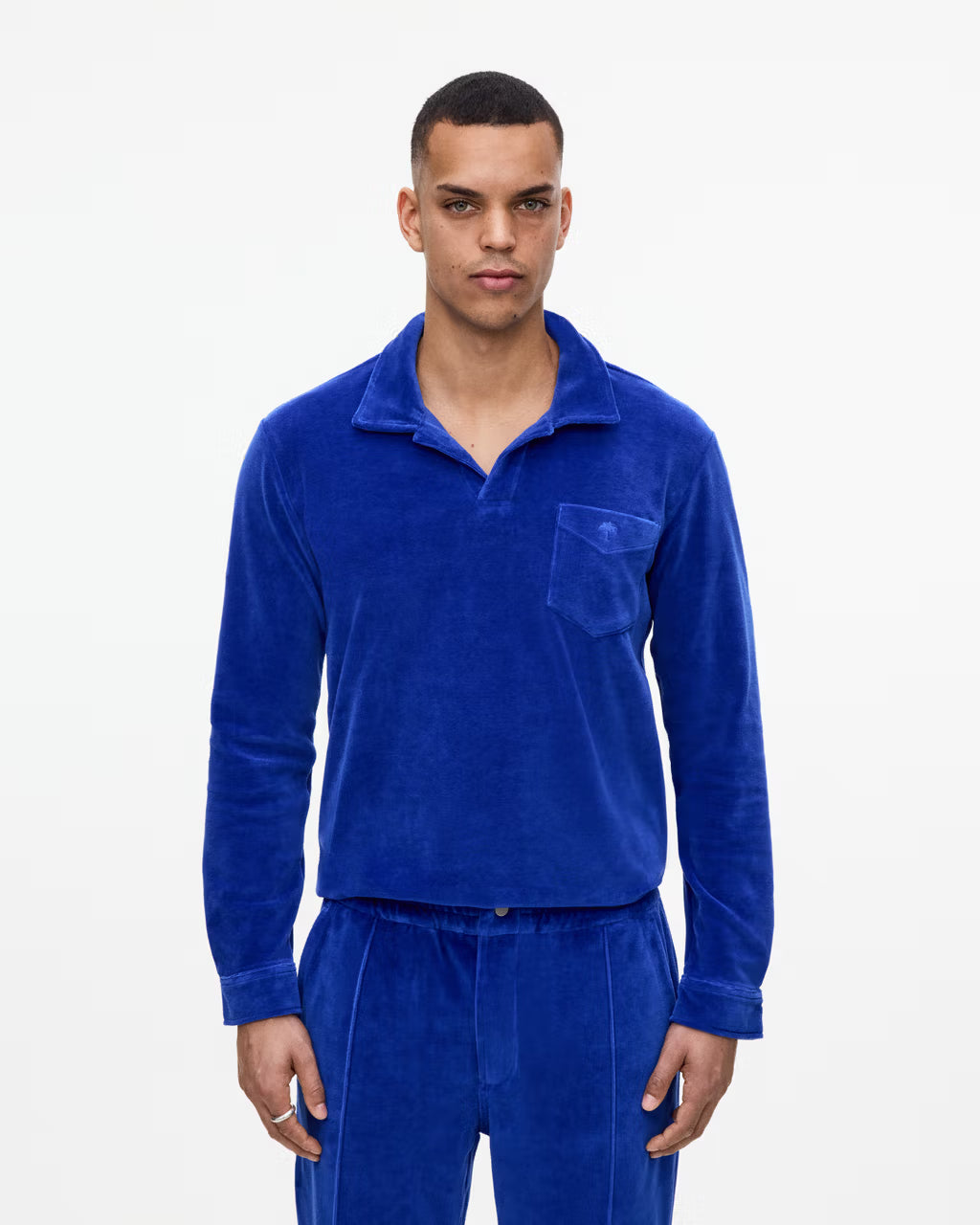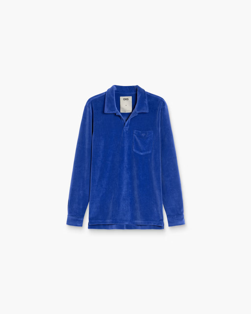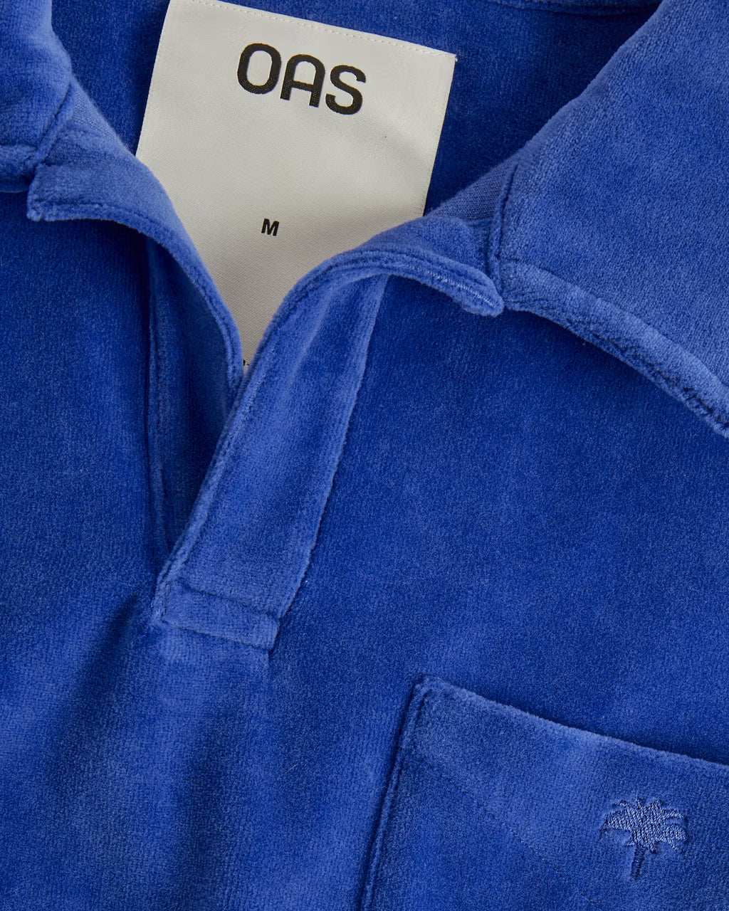OAS - Soft velour long sleeve in a serene sky blue, crafted from 80% cotton and 20% polyester. Features a refined polo collar, functional chest pocket with palm tree embroidery, and buttoned cuffs. Midweight knit construction offers comfort and durability. Designed in Stockholm, made in Portugal.