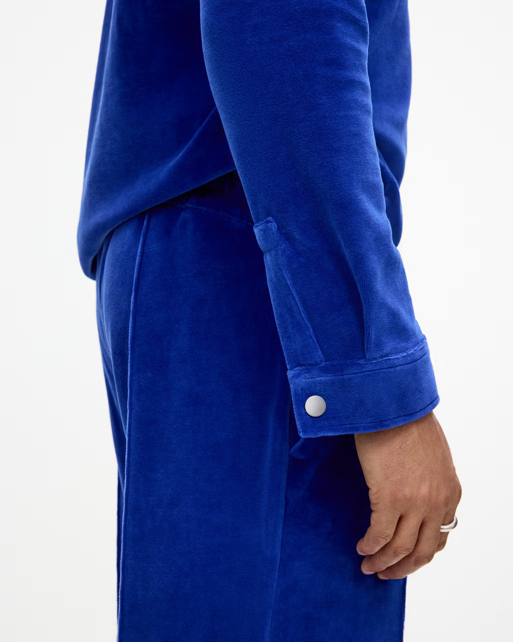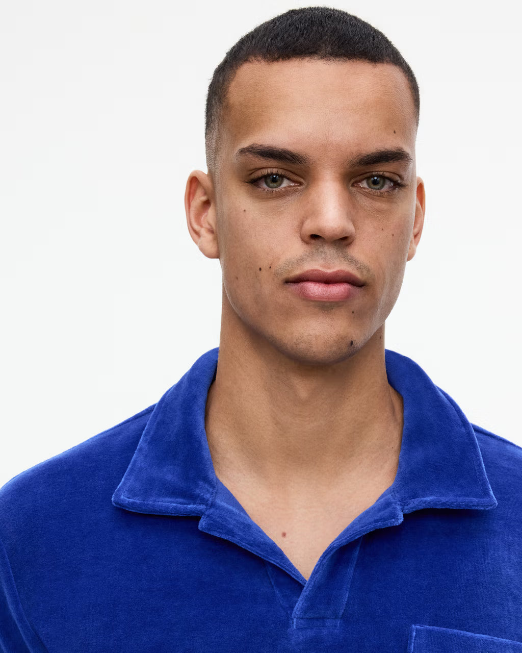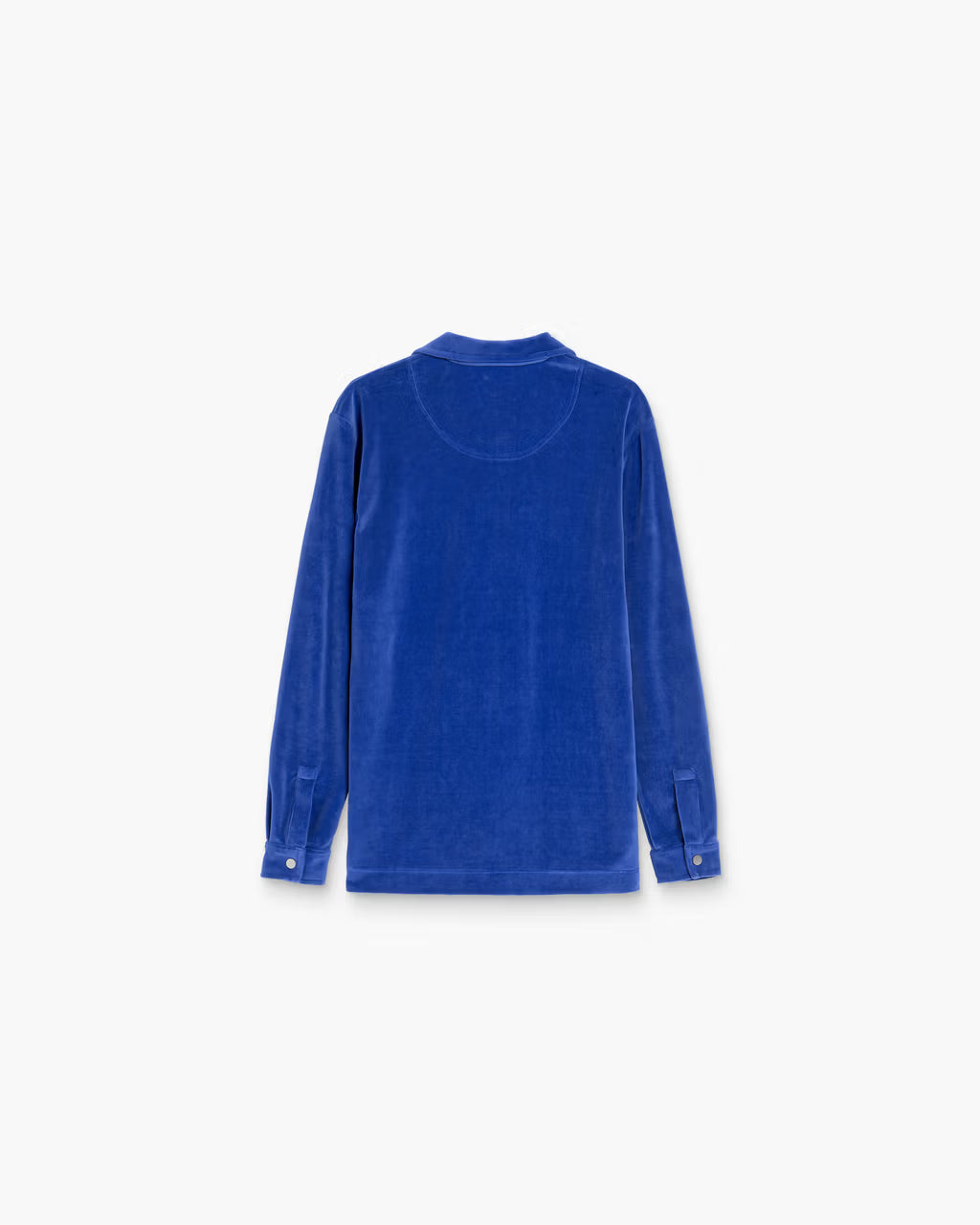 OAS - Soft velour long sleeve in a serene sky blue, crafted from 80% cotton and 20% polyester. Features a refined polo collar, functional chest pocket with palm tree embroidery, and buttoned cuffs. Midweight knit construction offers comfort and durability. Designed in Stockholm, made in Portugal.