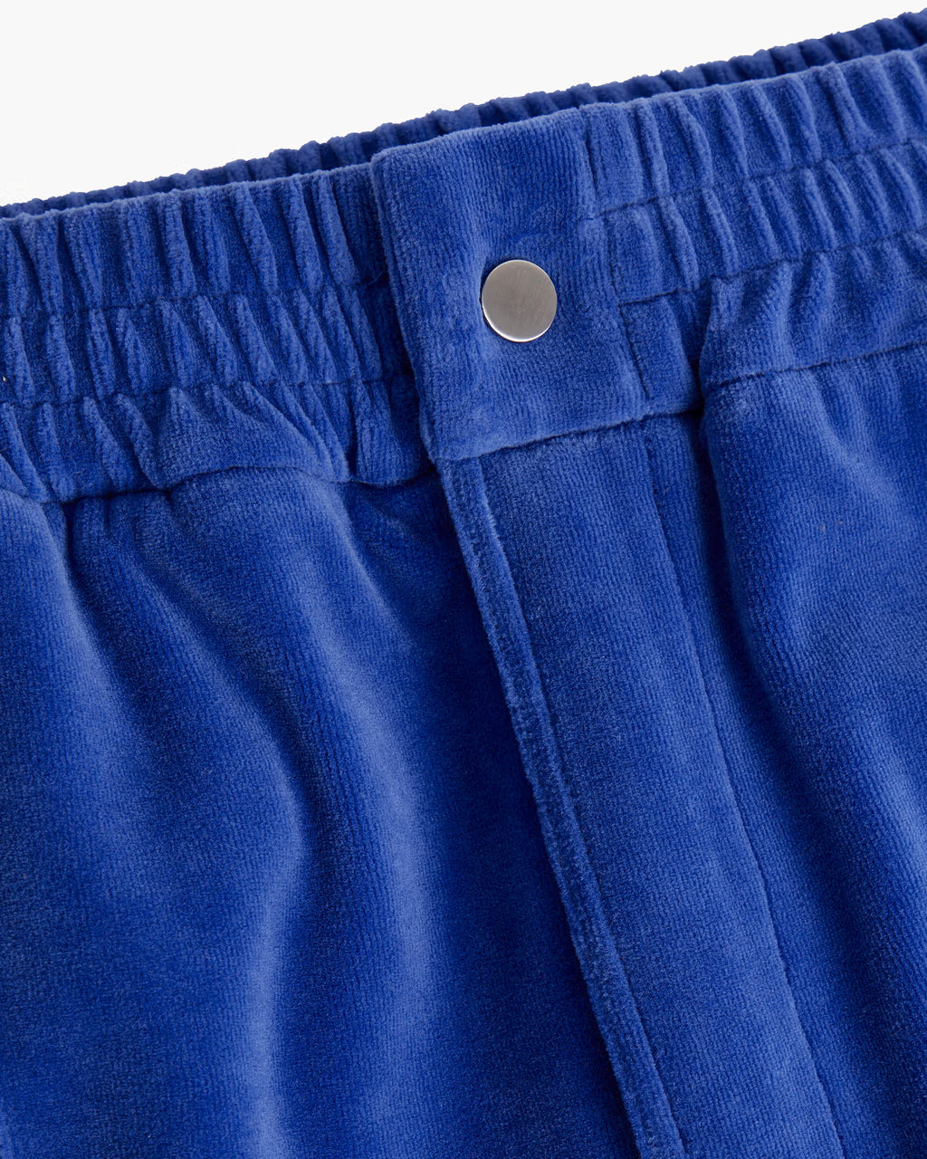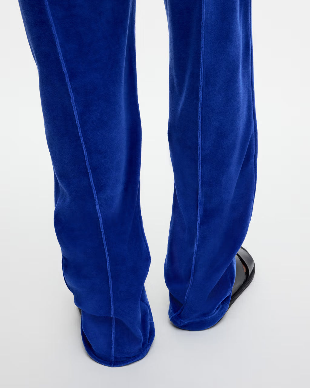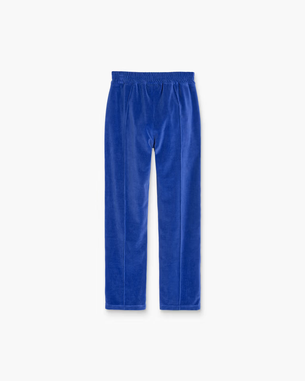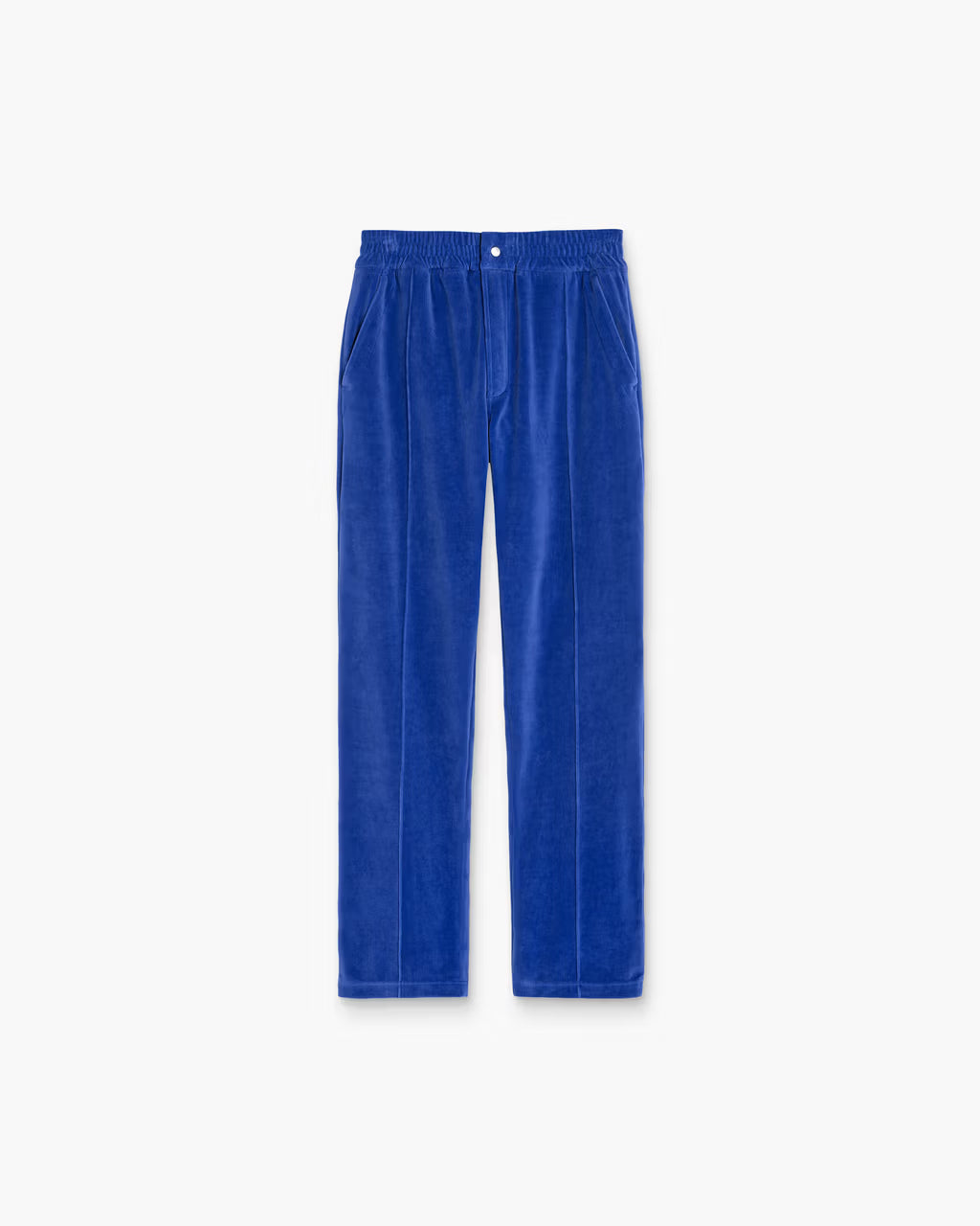 OAS - Azur Velour Pants in a soft, luxurious knit fabric inspired by summer skies. Features a refined longline cut with front and back pleats, elastic waistband with concealed zip fly, and practical side pockets. Crafted from a cotton-polyester blend and made in Portugal.