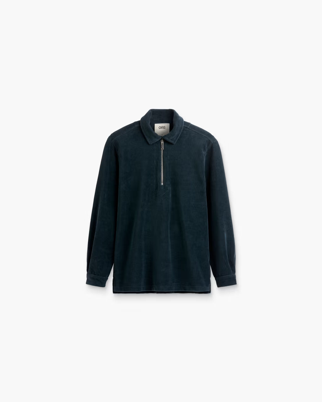 OAS- Soft knitted cord velour shirt in dark blue with a relaxed, dropped-shoulder silhouette and quarter-zip front. Crafted from an 80% cotton, 20% polyester blend for comfort and durability. Designed in Stockholm, made in Portugal.